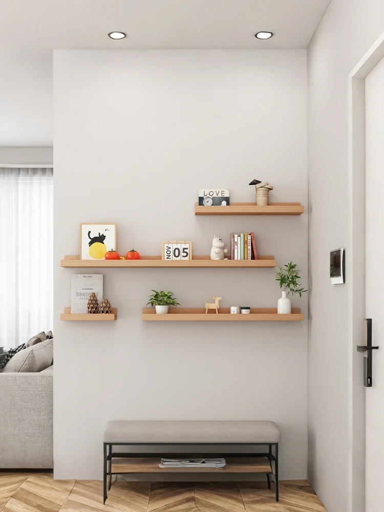 穴あけ不要!おしゃれな無垢材一文字型玄関用壁掛け収納シェルフ。背景装飾としても最適、絵画や小物を美しく飾れる壁面ディスプレイラック。お部屋をもっとスタイリッシュに演出します!