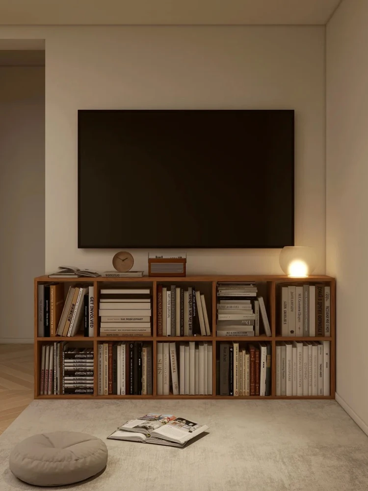 天然木材使用のテレビボード兼書棚!スタイリッシュなデザインで、部屋を美しく演出。壁にぴったりフィットする収納力抜群のラック。リビングや書斎に最適なコンパクトなキャビネットです!