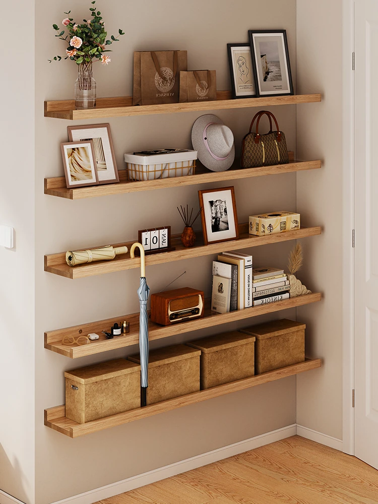 ドア後のスリムな収納棚!無垢材使用の超薄型ウォールシェルフ、狭い隙間にもぴったりフィットする松の一文字板。塗装不要のシンプルデザインで、お部屋をスタイリッシュに演出します!